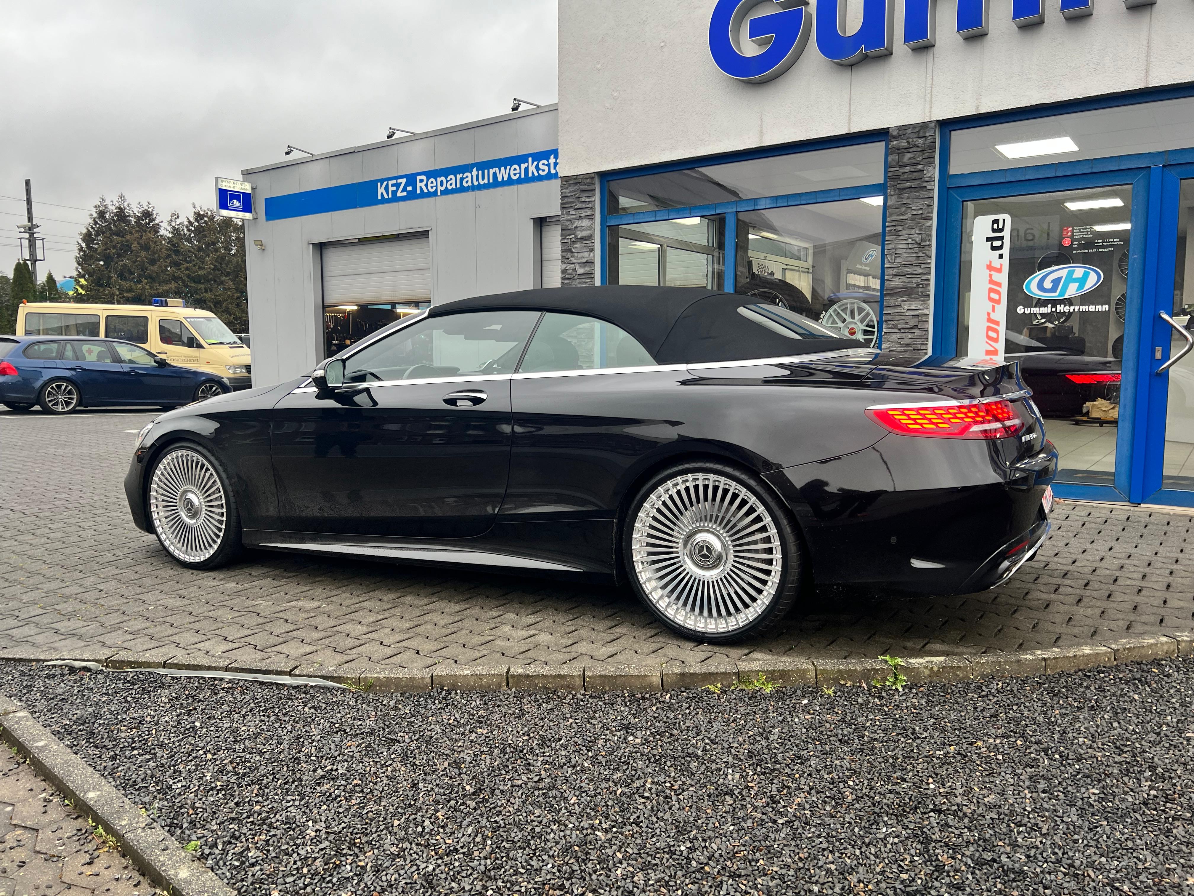 Für den perfekten Auftritt sorgen 22 Zoll Alufelgen, kombiniert mit einer 255er Bereifung auf 9,5×22 an der Vorderachse sowie 305er Reifen auf 11×22 Felgen an der Hinterachse. Das Setup verleiht dem Cabrio eine kraftvolle Silhouette und unterstreicht den exklusiven Charakter des Fahrzeugs.